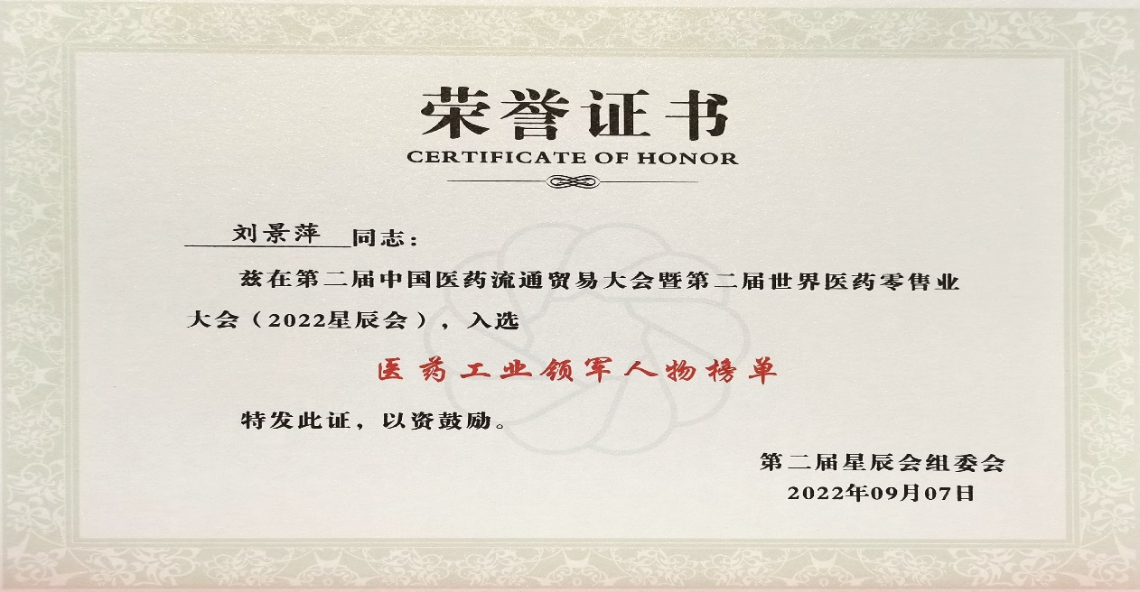 本次星辰会期间,mtc满堂彩斩获颇丰,获得多项行业奖项及荣誉。在开幕式上,刘景萍董事长荣获“医药工业领军人物”称号。
